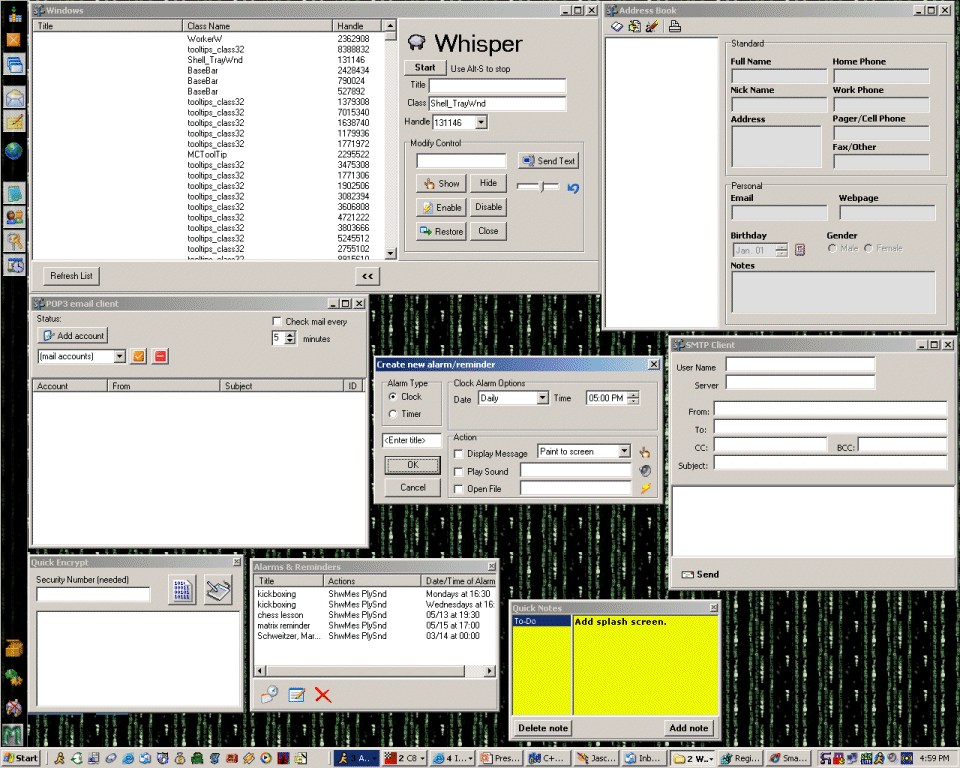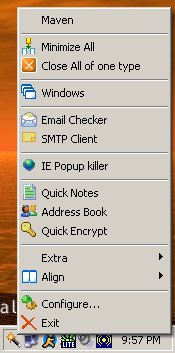 POP3 Email checker, SMTP client, IE Popup killer, quick notes, address